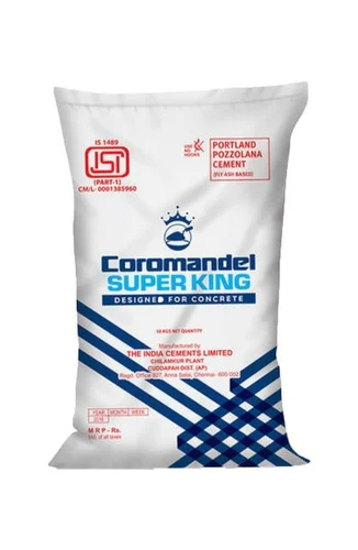 Product DescriptionCoromandel King PPC Cement. PPC Cement is used for brickworks, plastering and all other not structural cement works, it has more flyash content than OPC. PPC cement is used where Extra Durability is required and is preferred in mass construction. It usally cost less than OPC.