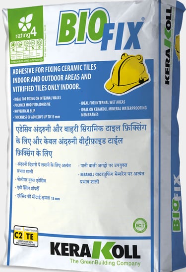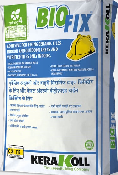 Mineral adhesive for fixing ceramic tiles, vitrified tiles and stones on floor and wall. Preparation of the surface All surfaces must be dimensionally stable according to IS 1443-2018, level, cured, undamaged, compact, rigid, resistant, dry and free from any debonding agents and from damp rising.