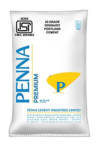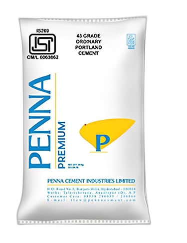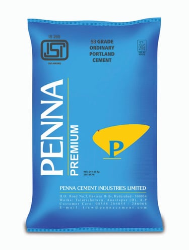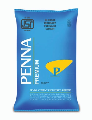 Penna Premium OPC 53 Grade Cement, Packaging Type: Sack Bag, Packing Size: 50 kg. This is an Ordinary Portland Cement which has minimum 28 days strength of 530 Kg/CM2 (53 MPa) and is designed to meet all the specifications mentioned in BIS IS: 12269 (1987).