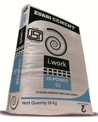 Zuari – OPC Grade 53 (Ordinary Portland Cement – Grade 53)Also known by the name 'grey cement'. Used to produce pre-stressed & precast concrete with high strength. Meets BIS requirements of minimum 28 days compressive strength which should not be less than 53 MPa (IS : 269 – 2015).”